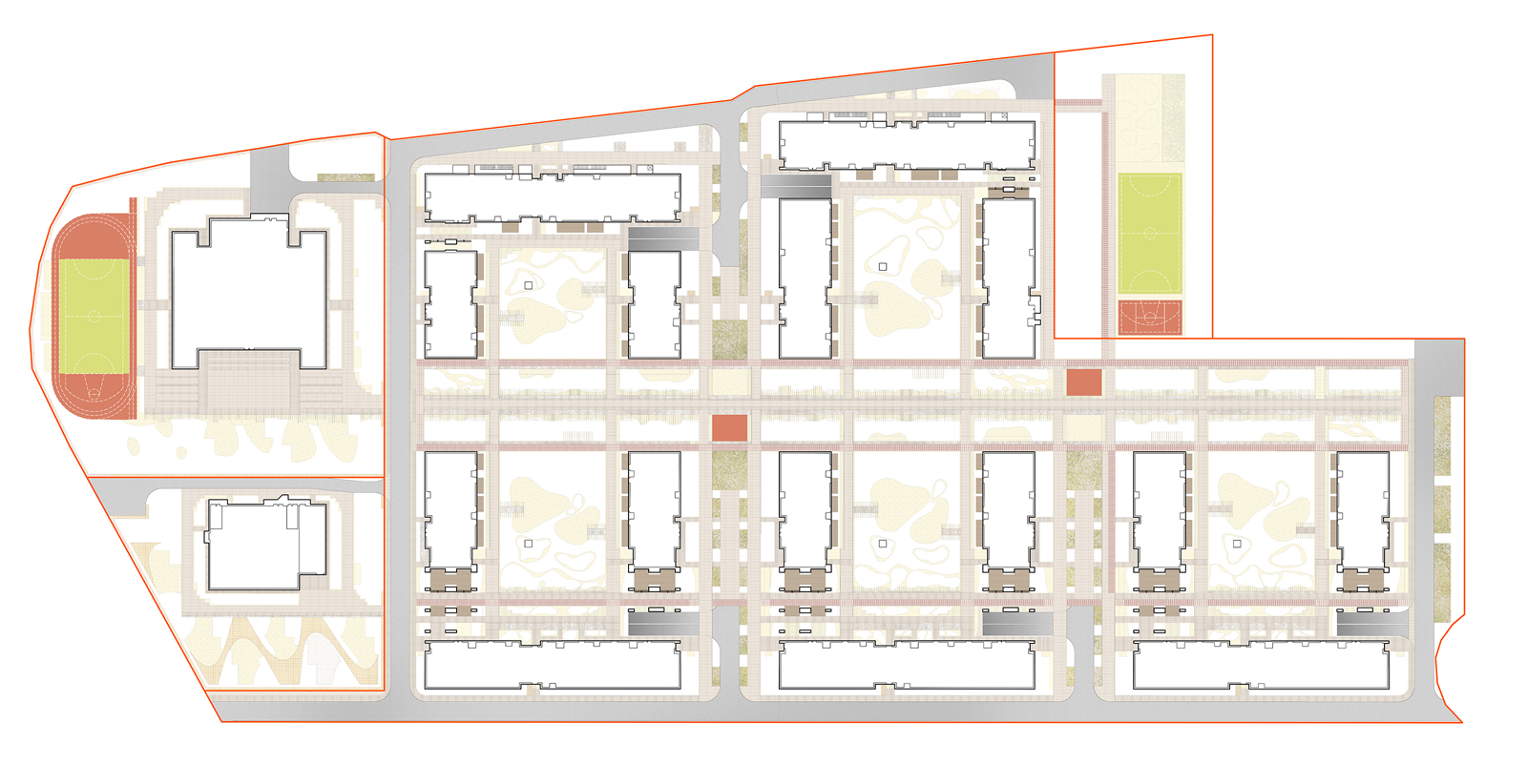 Балтийская галька выбрана из-за широкого диапазона цветового и тонового спектра. Форма игровых площадок образуется агрегированным абрисом зон безопасности игрового оборудования площадок. Для удобства доступа площадок в демисезон к ним проложены дорожки дискретного мощения по аналогии с мощением центральной аллеи. Газонные покрытия, равно как и посадки кустов, со всех сторон фланкированы поясами отсева шириной 400мм для соблюдения технологии «швейцарского газона».