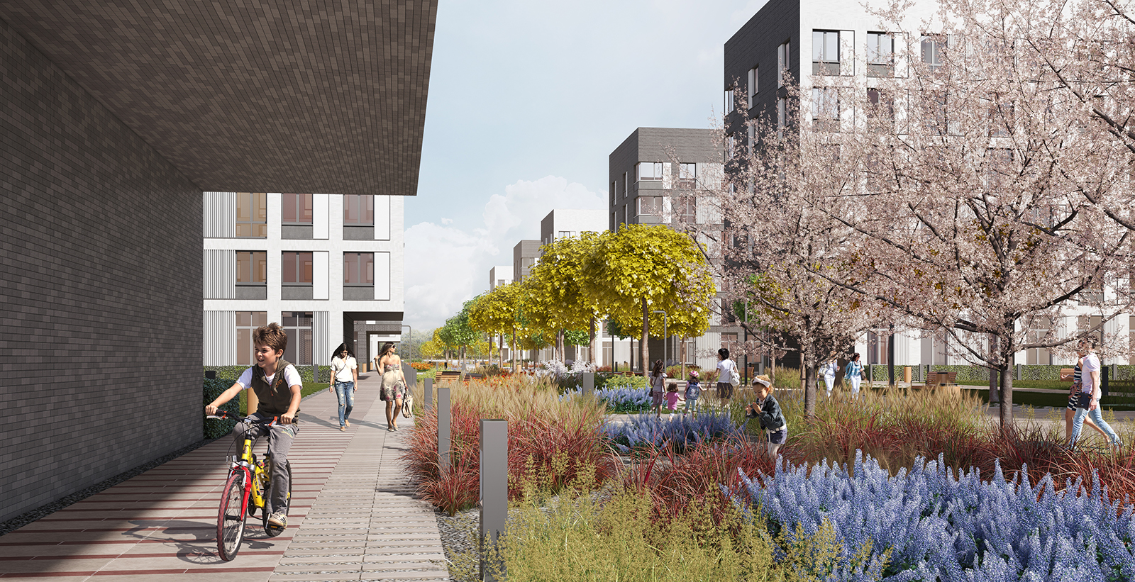 Концепция зеленой программы базируется на поддержании всесезонного цветового разнообразия внутри дворовых пространств и на аллее за счет композиций травянистых многолетников и кустарников, а также посадок крупномеров.