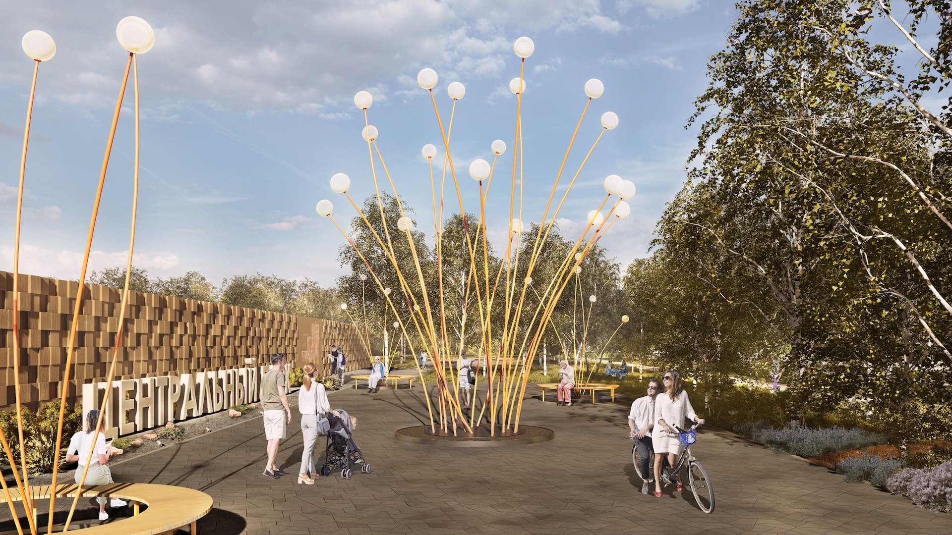 Событийная поляна с дождевым лугом и площадкой массовых мероприятий со сценой и амфитеатром. Всесезонная культурная площадка и точка притяжения городского масштаба, а также место тишины и повседневной рекреации.