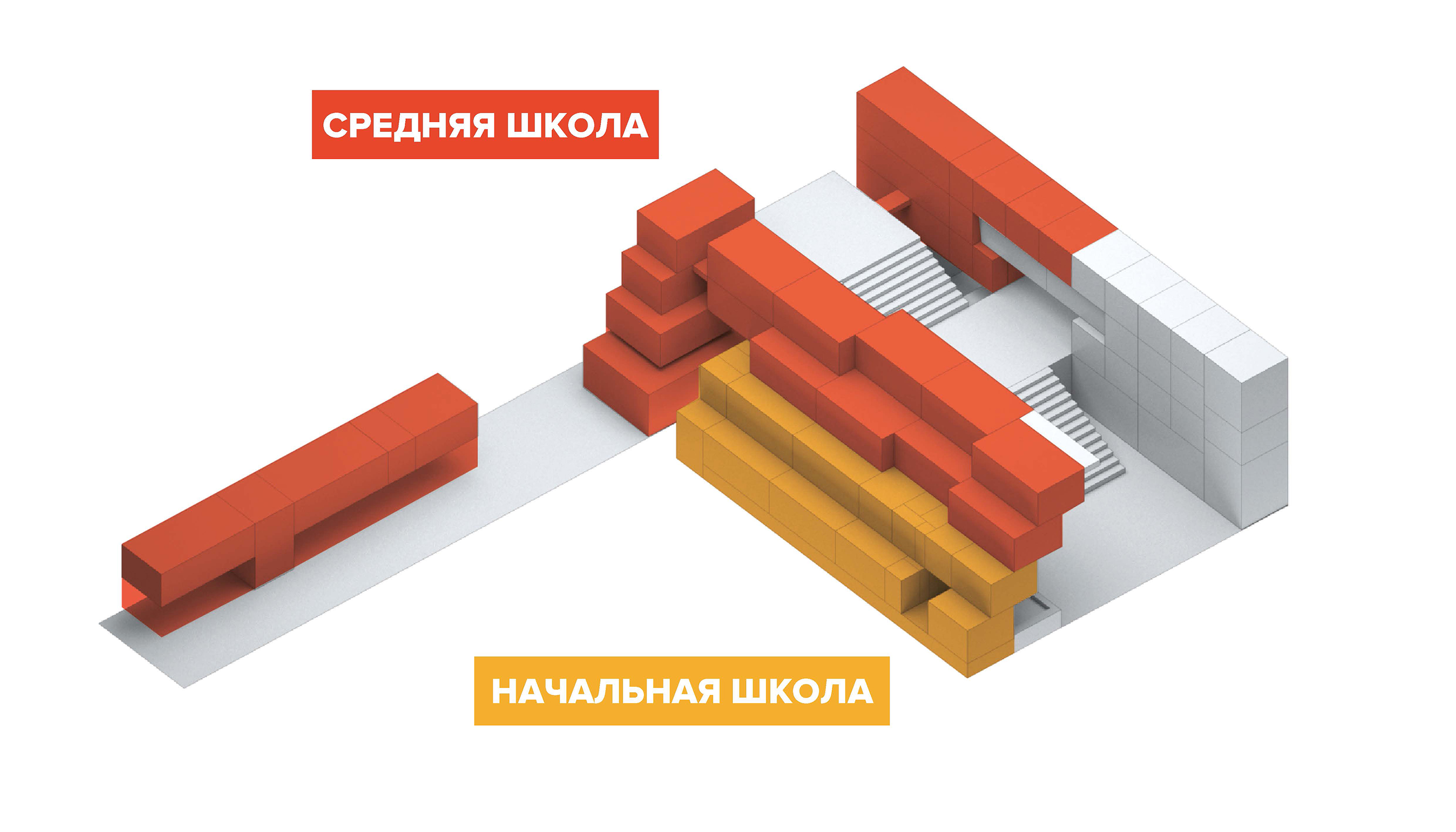 Классы начальной и средней школы образуют склон, обращенный к реке и школьному двору. Уступы склона, в свою очередь, образуют террасы с выходом из рекреаций и из каждого класса - можно проводить занятия на свежем воздухе или просто раскрыть остекление для доступа свежего воздуха в класс. Классы и игровая начальной школы в наземном этаже выходят непосредственно на наружные площадки начальных классов школьного двора.