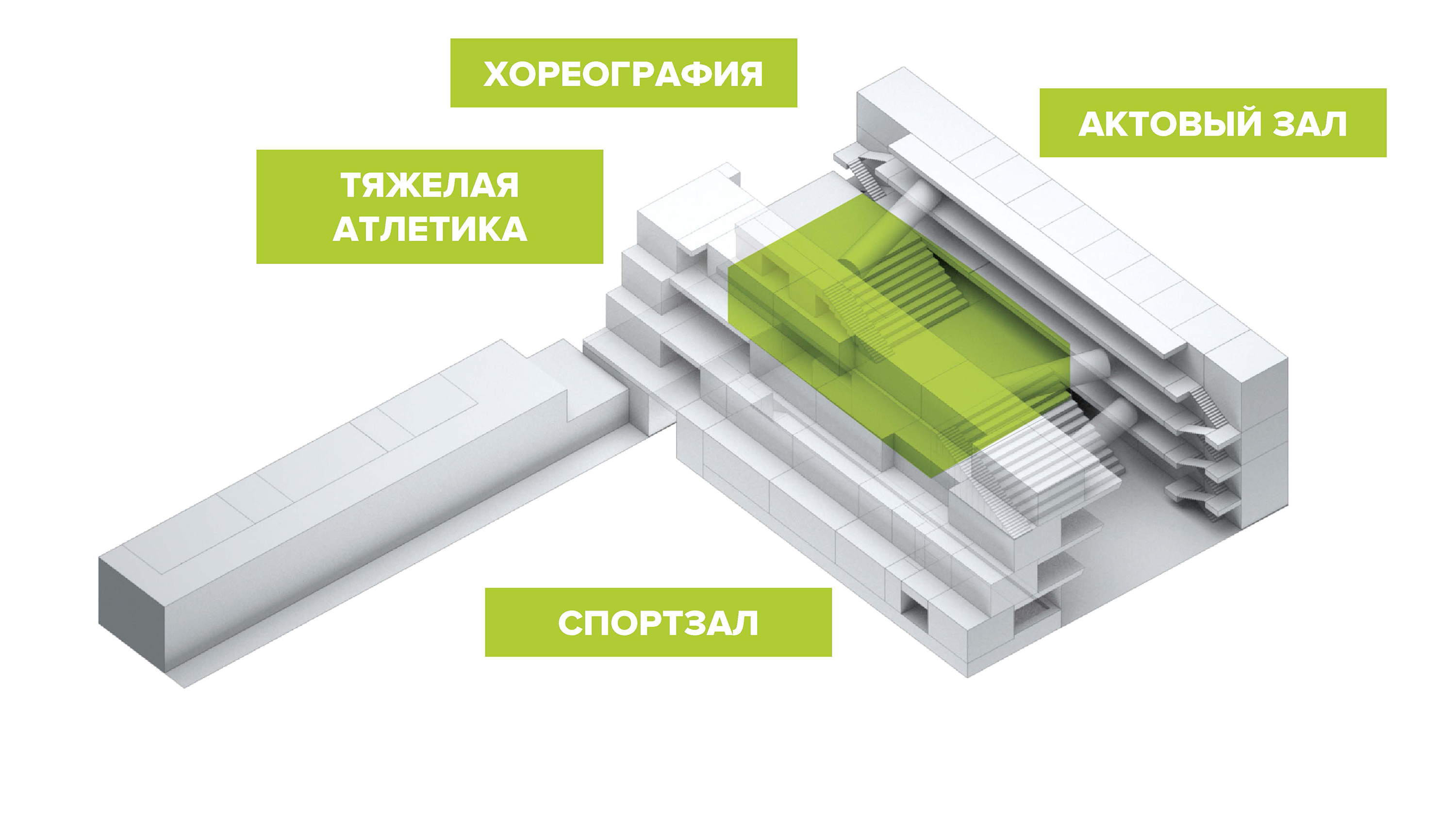 Объемы спортивного зала, залов хореографии, йоги и кластер кабинетов администрации образуют внутри общего пространства «Каньона» единый объем «Амфитеатра», который может быть подразделен на разные сценарии одновременного использования. Над амфитеатром расположены переходы между рекреациями школьного корпуса и рекреациями компьютерных и лингафонных классов с естественно-научными лабораториями.